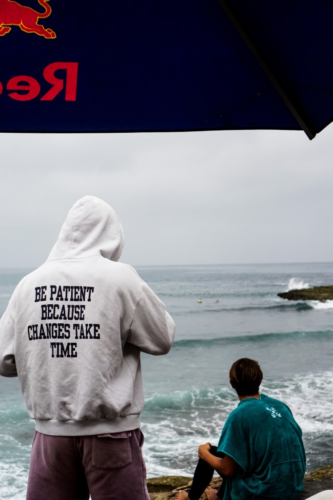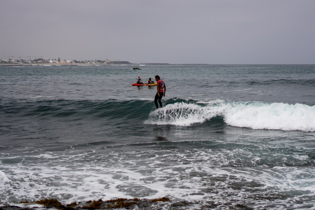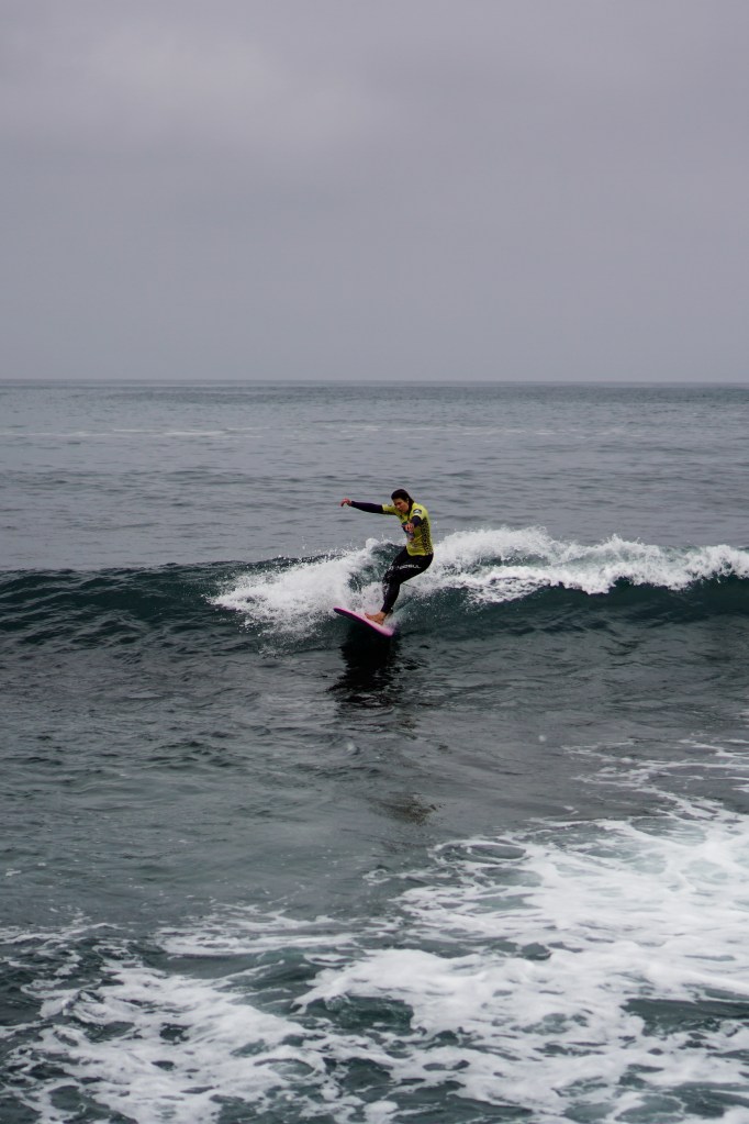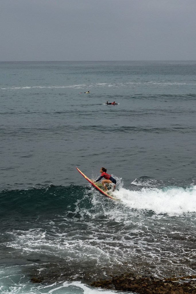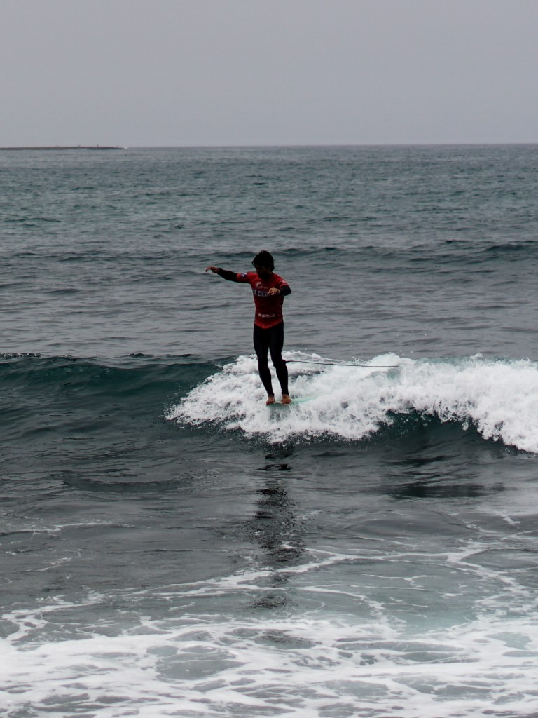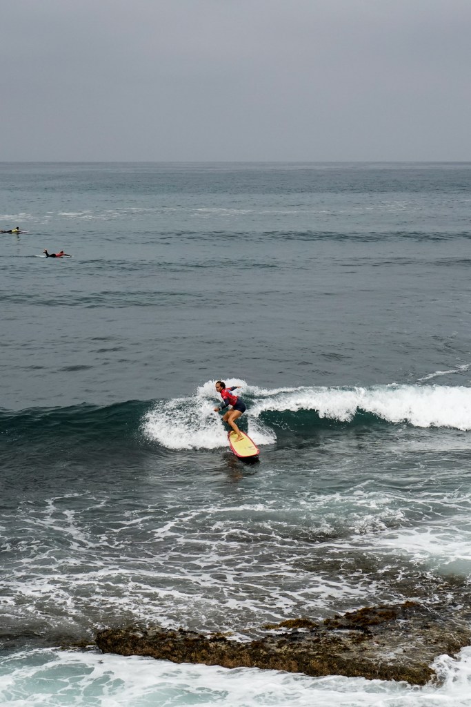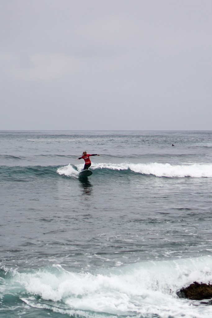 Dopo la magia del primo giorno, gli atleti si svegliano sotto un cielo grigio e con una leggera brezza da nord-ovest. Lo swell dei giorni precedenti ha perso forza e qualità: le onde sono leggermente più choppy, e tra una serie e l’altra bisogna aspettare a lungo. È una giornata che richiede ancora una volta pazienza e un’attenta lettura del mare per individuare le onde giuste, quelle che permettono punteggi elevati.
