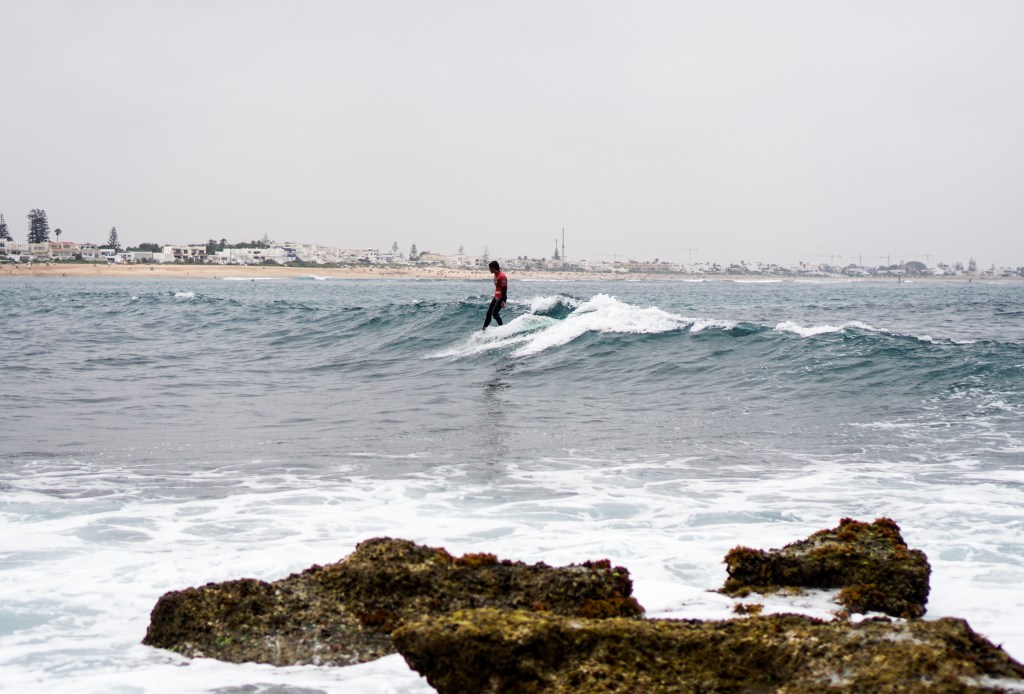 Competition starts late morning with rising tide. The swell isn’t the biggest, but Bouznika Right still offers some perfect lines for longboarders. The European athletes show notable patience and technical maturity.